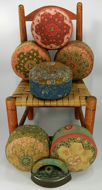 I have always been drawn to hex quilts and my Hitty customers will know I have included hex quilts in Hitty scale for years. Recently I saw some made in canning jar lids, but not content with that because I wanted more color expression that using my older sewing-pincushion top box idea, that would be just my style. So here is a new pincushion kit, really easy to do with nearly all handwork with the hexes supplied in the kit printed on reusable freezer paper. Pincushions are stuffed with wool (also in the kit) and all is over a foundation of a round paper box, included. The kit only has one fabric combination as shown, but to inspire you to see the possibilities to use your own scraps, I made up 6 more for the picture (click on image at right) .(7 available)