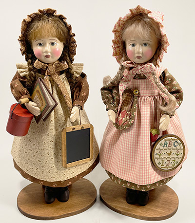 THEIR STORY: My first 9" molded papier mache doll, Louisa, who started the many dolls I have made from this favorite mold (my own original). Following Louisa, there were others: Elizabeth, the Christmas Girl, Kindred Spirits (UFDC), Annabelle, three dolls from the Secret Garden (UFDC), and last was the 1950's Doll - A Self Portrait of Me in First Grade (1956), also for UFDC. This last doll came out with the Covid outbreak and although she was made, her companion, which was going to be a school girl from about the 1850's, was never made due to conventions being canceled that year.