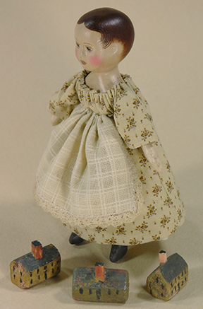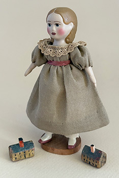 I think the reason this doll so excites me is that I delight especially in the making of accessories for my dolls. I have had this idea for some time but couldn’t get past what size doll to use, because I really wanted it to be in the Tiny Doll size, but didn’t see how I could execute all the details for a doll that small. Then, just like that while I was unpacking some very old work of mine, the Plan unfolded in an instant. So, here it is. She is called the Little Dollmaker and features a 3.5” Tiny Doll in a dress and lace- trimmed pini and cap, sitting on a small painted wooden bench where she is sewing for her 1” (yes, one inch) wood clothespin doll. She will have her working brass scissors, pincushion, a spool of thread, a tiny stack of possible fabrics and a very tiny dress pattern for her very tiny doll.