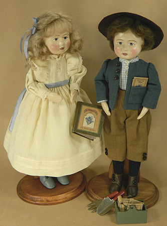 These 9" papier mache and cloth dolls were made in a limited edition exclusively for The United Federation of Doll Clubs, July, 2019. I chose the theme of The Secret Garden for that year's national convention "Star Struck" - as the most fitting to my style among the suggestions presented. The author of this beloved tale, Frances Hodgson Burnett, spent many years in Tennessee building a successful writing career. The beloved story, The Secret Garden was written in 1911.