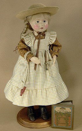• Spoiled Mary Lennox shown in her fancy white dress with blue buttoned boots and holding a scond book about the flowers she would learn about in the secret garden. Includes her wood stand. Original price $695, sale price