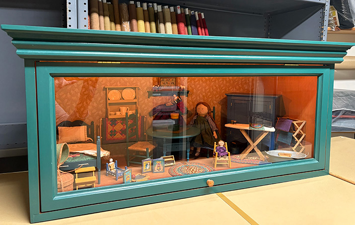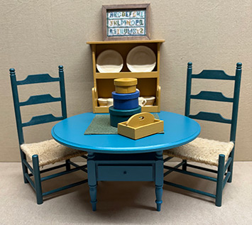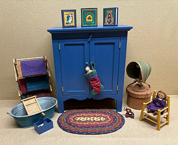 This is a barrister style glass front "room" filled with assorted items that were part of the years of the Early American Doll Series Clubs for Finished Things from 1985 - 2004. For this sale, I am trying to keep everything from this estate complete as a set. If it doesn't sell complete (which would be a shame), I will sell all of its individual items separately, including the glass front "room" display. Size is 36.5" wide (at top corners) x 16.5" tall x 16" deep, and has interior lighting, a fabric back wall and the glass front lifts and is held up with a wood prop (included). The complete set includes everything you can see inside and shown in separate photos below, including the 9" decorated feather tree not shown in the house pictures, but down below individually. The set has over 35 items and its value is about $2450 using old 2003 prices. Although 2003 prices are a significant savings from current values, it will be further reduced to $1850 for the sale. The best option is for the set to be picked up here at my workshop, but we may also be able to deliver it to locations within New England and Eastern NY for a $150 delivery fee or it could bs shipped for a fee to be determined (estimate of $150-$250 depending on the buyer's location).