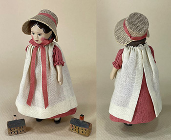 Due to so many requests, I have done another doll for 2023-24. Since I have loved the works of Kate Greenaway, the inspiration for this next doll comes from her many charming illustrations of children. Oh, the pinafores and bonnets. So the photos above are the final results.