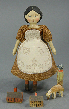 More of the nursery rhyme characters are the well known Jack and Jill. The two-doll set comes on a wooden stand and both are holding a tiny red pail. The inspiration for their clothing was taken from paintings by Kate Greenaway with most of the fabrics and trims specially hand dyed here in my workshop to get the look. Like all the other dolls in this Tiny Doll Series, these too are 3.5" tall. This set, unlike the others, will be limited in number to 24 total. $475 for the set on their stand.