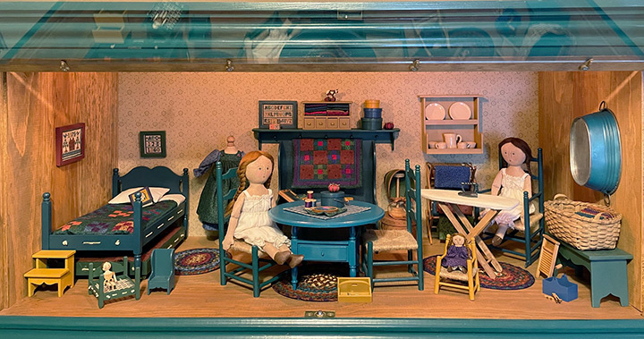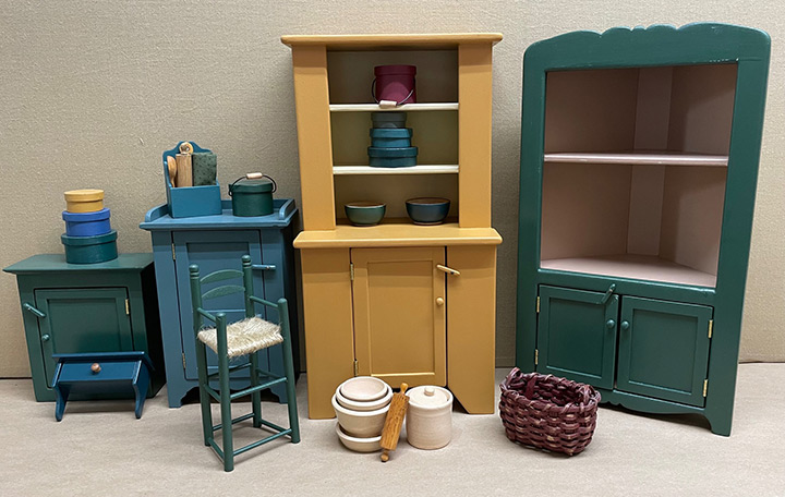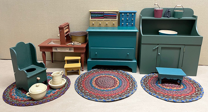 An important note of clarification: Many of the larger cupboards and much of what is actually shown below is part of the contents of the large limited edition doll house, but which were also made available (only in finished form) to the collectors of the Early American Series.