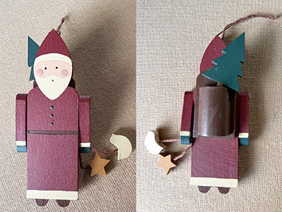 This Santa ornament was originally made as a limited edition for the League of NH Craftsmen in 1992 as part of their several decades long Annual Ornament and long not available. Over all these years I have several people who contact me each year to see if any have turned up for them to buy. None have, but in my clearing out of attic stuff, found enough pieces to make a small number. These are about 3" tall and each Santa has movable arms, one carrying a wooden star and dove, and on his back, a backpack with a wooden Christmas tree. These may be pre-ordered for a late fall delivery. Due to the small production, his price will be $75. Orders placed now will not be charged until ready to ship. Shipping by early Dec with $9.95 shipping/handling).