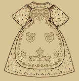This outfit has a cloth bonnet, dress, apron all in assorted