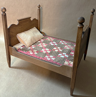 This bed was primarily designed to fulfill a promise to include a bed for the Collector Club for my 12" Izannah Walker Dolls which included an extensive wardrobe, many accessories, a carry case andk furniture. What you see in the photo is a prototype of what the real item will look like. Dimensions are 13" long x 10" wide x 11" tall and include the pink and brown patchwork quilt, mattress and pillow with lace trimmed sheet and pillowcase. This is a feeler to see if enough people would like to have one in order to be able to put it into a small and limited production. If you click to order it, you will not be charged until we determine we have enough orders to go ahead. Once that is determined, we will notify buyers and take a 20% deposit with delivery projected for late January 2026.