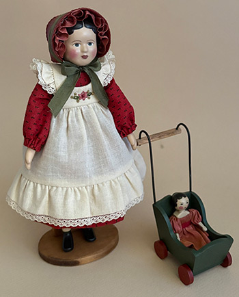 Outfit has a ruffled and embroidered pini over her red print Christmas dress and is completed with her holiday fancy bonnet. More details include pini buttons in back and the bonnet is red linen mesh with silk ruffle and ribbon tie. Her accessories are a tiny painted doll stroller with a 2" tall wood doll dressed in the tiniest ribbon-trimmed silk dress. Price for the set is $235. No charge will be applied until closer to shipping in mid November. This item will be shipped separately ($9.95 shipping charge).