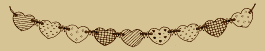 Nine stuffed hearts of old-fashioned prints and homespuns are connected with old-style buttons and linen twine ties. A nice country touch for a door, mantle, cupboard front or headboard and nice against Christmas greenery. Easy to make this 32" garland with two hanging loops at either end. $5.00 Add